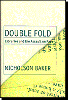 Baker is, as most know, a novelist and essayist who first came to the attention of librarians and archivists with his writings about the destruction of card catalogs and books at the San Francisco Public Library in the early 1990s (his 1994 essay, "Discards,"—the opening salvo in his becoming a library activist—has been reprinted in his 1997 The Size of Thoughts: Essays and Other Lumber [New York: Vintage Books, 1977], pp. 125-181). Since the mid-1980s he has produced a series of novels and one volume of essays, building a reputation as one of America's finest and most interesting writers. Double Fold, while it is Baker's first major nonfiction volume, is not a major departure from either his interests or his writing style, an important point because many seem so willing to dismiss him because he is not an expert on libraries, preservation, or the issues he is discussing. I think this is a mistake.