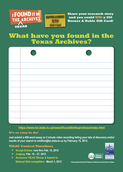 - Taking Notes: Texas State Archivist Jelain Chubb worked with her communications team to develop a swanky poster and handy note card encouraging archives visitors to jot down what they found and then to convert those notes into an entry for I Found It In The (Texas) Archives contest.